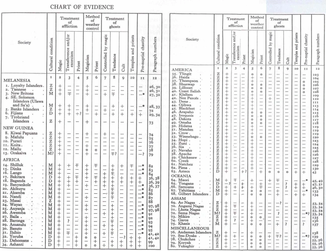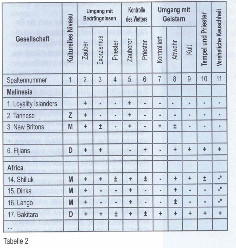 In der linken Spalte ist ein Teil der untersuchten Völker verzeichnet. Die nächste Spalte (Nr.1) verzeichnet das „kulturelle Niveau“ (Z=zoistisch; M=manistisch; D=deistisch). Dieses ergibt sich aus der Art des Umgangs mit Bedrängnissen (Spalten 2-4), der Wetterkontrolle (Spalten 5 und 6) und des Umgangs mit Geistern (Spalten 7-9), und ob Tempel und Priester (Spalte 10) vorhanden sind. Die Symbole in den Spalten weisen darauf hin, ob ein bestimmtes Verhalten vorhanden war (ein „Pluszeichen“) oder nicht (ein „Minuszeichen“). Ein „Plus-Minus-Zeichen“ (±) kennzeichnet unsicheres Wissen und ein Zeichen mit Fragezeichen (z.B. +?) weist auf fragwürdiges Wissen.