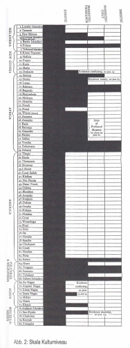 In der zweiten Abbildung wird das Kulturniveau der 80 Völker dargestellt. Die Reihenfolge der Auflistung der Völker ist mit der linken Skala identisch. Hier bezieht sich die Länge des horizontalen schwarzen Balkens auf das Kulturniveau: Je länger der Balken, desto höher das Kulturniveau. Die manistischen Kulturen teilt Unwin in zwei weitere Unterstufen (manistic-cult und manistic-tendance) ein, die für das Ergebnis ohne Bedeutung sind.