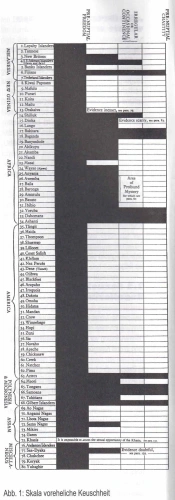Die erste Abbildung stellt die Ausprägungen der Kategorie „Voreheliche Keuschheit“ dar. In der ersten senkrechten Spalte sind alle 80 untersuchten Völker aufgelistet. Am linken Spaltenrand wird angezeigt, aus welchem Kontinent bzw. welcher Region die Völker stammen. Die schwarzen horizontalen Balken sollen darstellen, ob die Kulturen eine „sexuelle Freiheit vor der Ehe“ (pre-nuptial freedom - kurzer Balken) pflegen, „gelegentliche bzw. unregelmäßige Enthaltsamkeit“ (irregular or occasional continence - mittellanger Balken) oder „voreheliche Keuschheit“ (pre-nuptial chastity - längster Balken) fordern. D.h. der Balken, der alle Spalten abdeckt, kennzeichnet Völker, die eine voreheliche Keuschheit fordern.